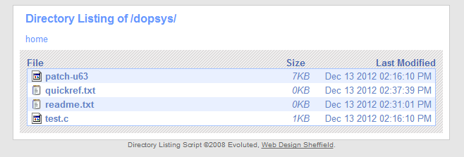 I found this tool dirlistingv3 which is just a .php page and a lot of images, and when you’ve put this in a folder, it is suddently possible to navigate around in this folder, just like you’d do in a standard filesystem. This is what it looks like in a browser when you try to access it,